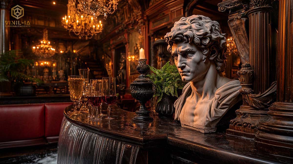 Una escena teatral y majestuosa. El busto del David se presenta en un entorno barroco con luces cálidas, cristalería y decoración opulenta. Su expresión firme refuerza la intensidad del conjunto. Este vinilo es ideal para interiores con carácter: vinotecas, salones clásicos, despachos o espacios de hostelería con estética vintage o señorial. La iluminación cálida y envolvente potenciará su efecto dramático.