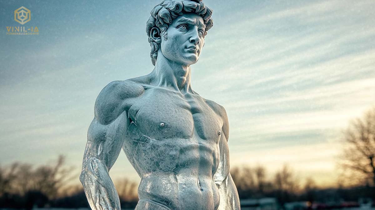 Una reinterpretación helada del David que fusiona la escultura clásica con la fragilidad del invierno. Su cuerpo parece tallado en hielo puro, brillando con la luz cálida del ocaso. Este diseño transmite una mezcla de fuerza contenida y serenidad visual. Perfecto para estancias modernas o minimalistas, este vinilo cobra vida bajo una iluminación natural que realce los reflejos del hielo, generando una atmósfera elegante y contemplativa.