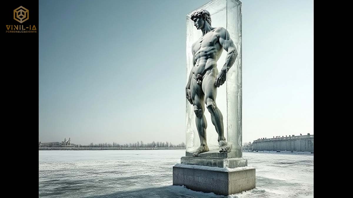 Esta imagen impactante presenta al David completamente encerrado en un bloque de hielo transparente. El efecto visual transmite una sensación de tiempo detenido, como una reliquia conservada en un futuro postclásico. Ideal para espacios amplios y contemporáneos, el vinilo destaca especialmente con iluminación blanca o azulada, que refuerce la profundidad del hielo y el contraste con el fondo despejado.